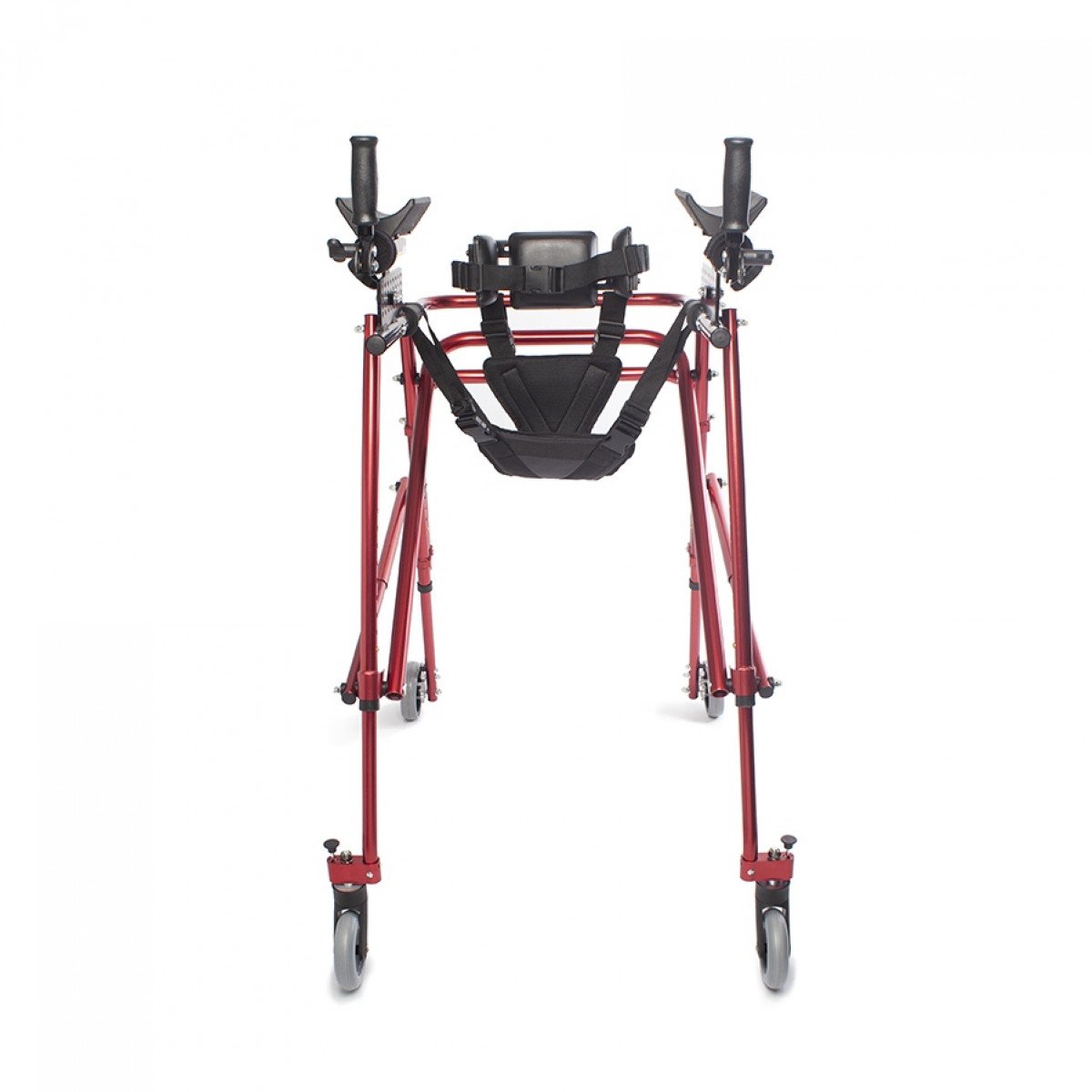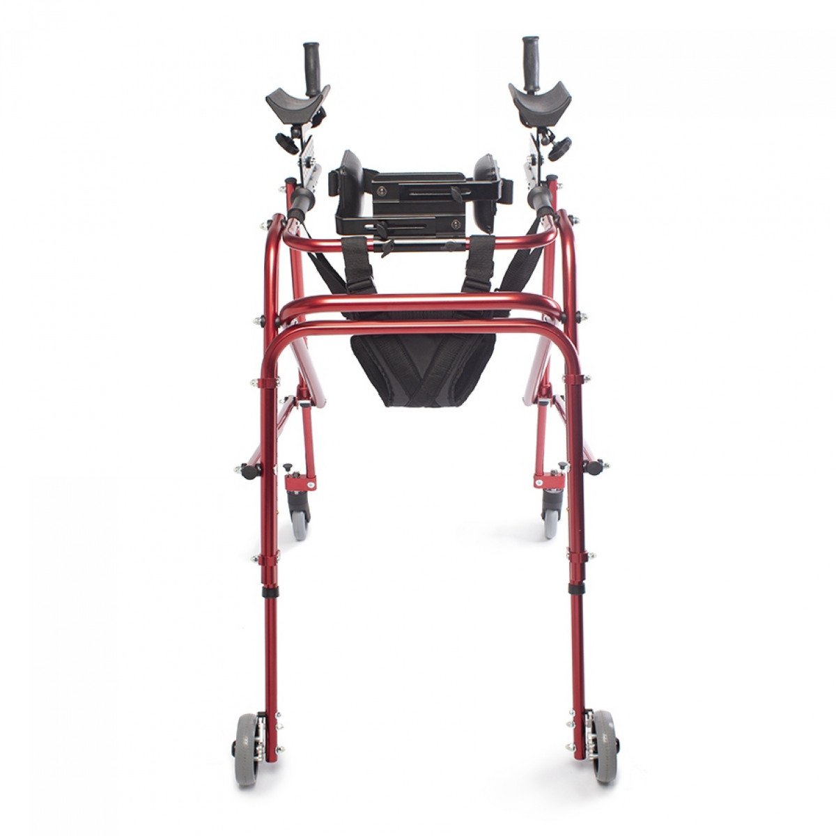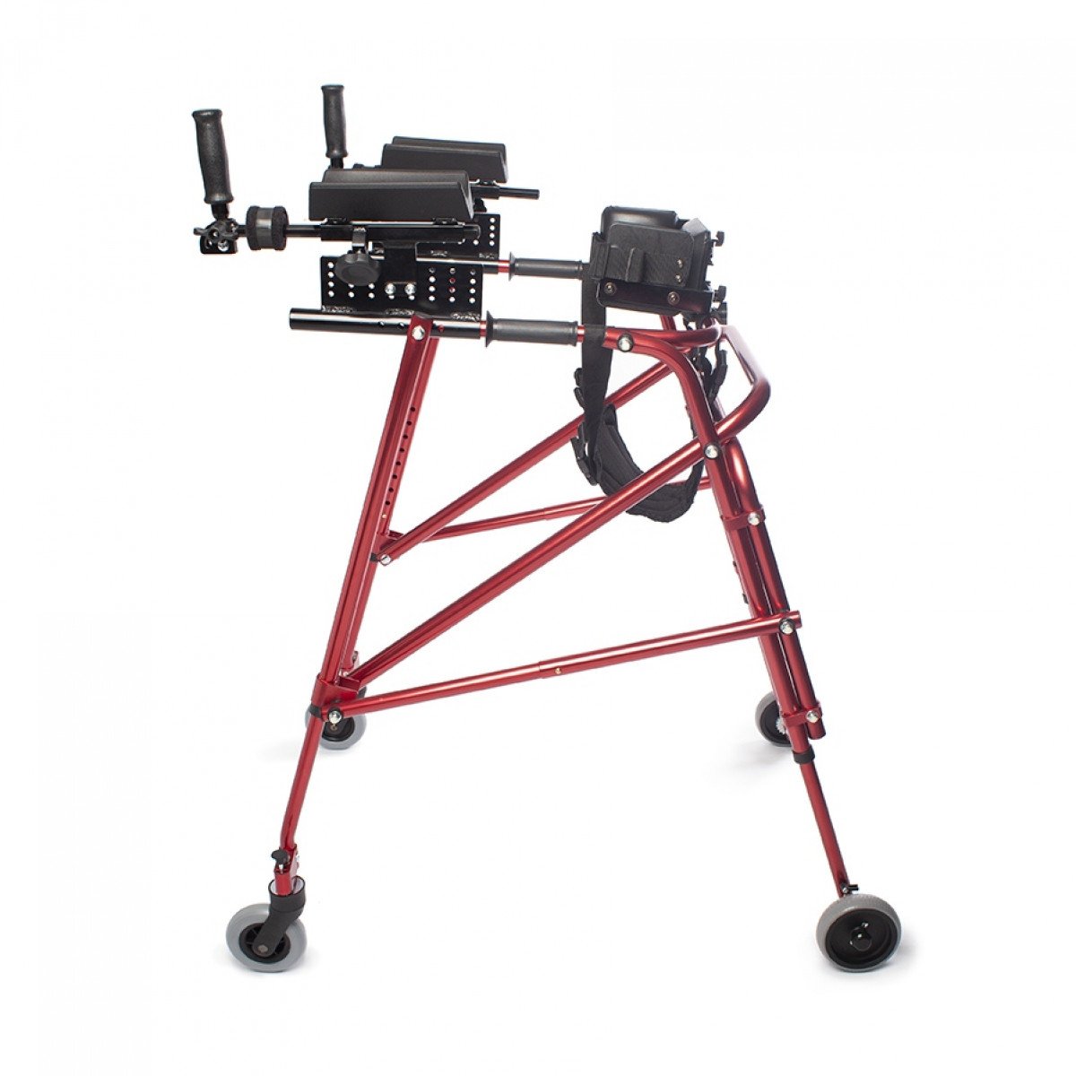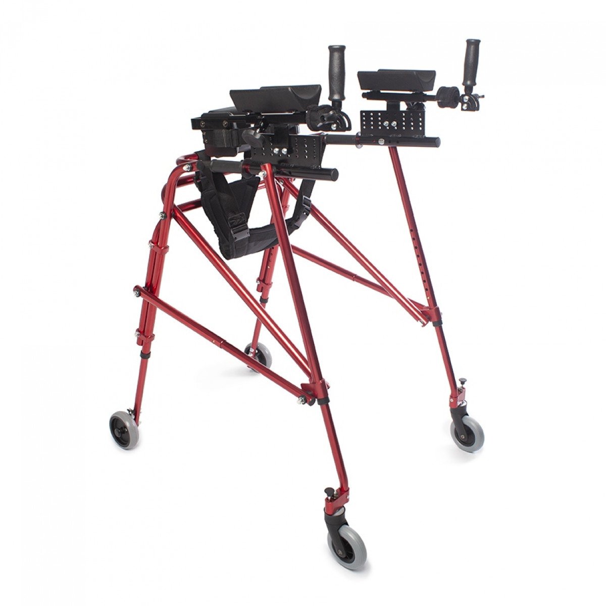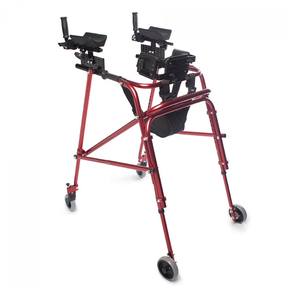 Ходунки легко адаптируются под ребёнка: можно отрегулировать высоту и настроить элементы поддержки под индивидуальные особенности. Дополнительные фиксаторы корпуса и таза помогают удерживать стабильное положение, а подлокотники дают уверенную опору при движении. Модель подходит для использования как в процессе реабилитации, так и в повседневной активности.