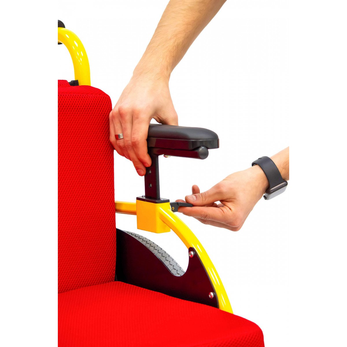 Пневматические задние колёса обеспечивают мягкий ход, а передние литые колёса не требуют обслуживания и добавляют устойчивости. Для фиксации на месте предусмотрены боковые стояночные тормоза. На спинке расположен небольшой карман — в нём удобно хранить необходимые мелочи.