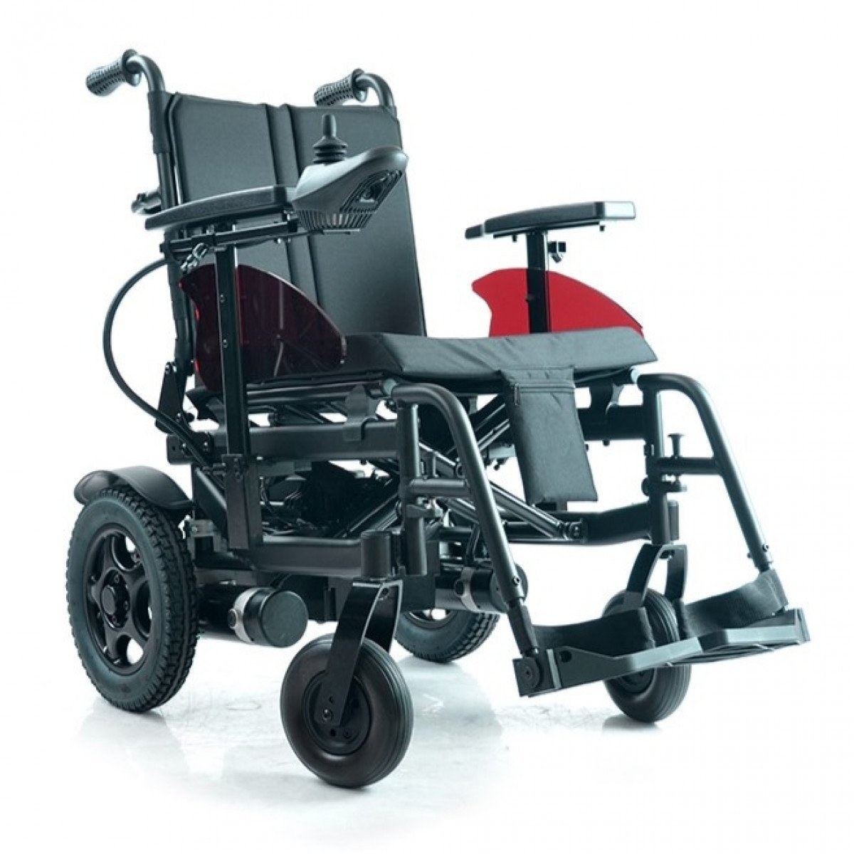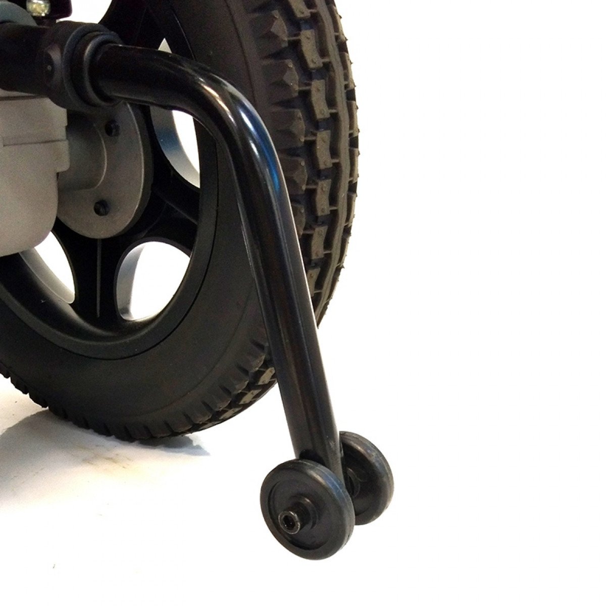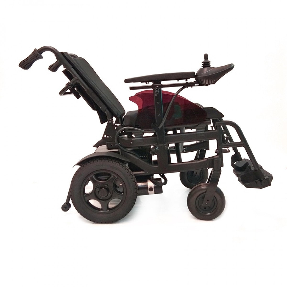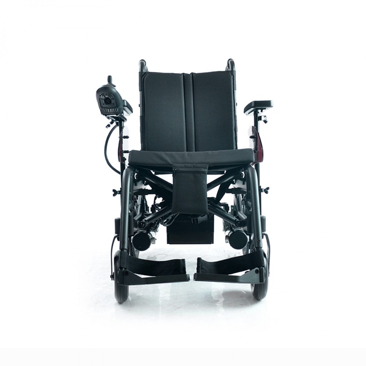Пневматические колёса обеспечивают более мягкий ход, а антиопрокидыватели добавляют устойчивости. Аккумулятор размещён под сиденьем в выдвижном блоке, не требует сложного обслуживания и легко извлекается. Для безопасности предусмотрен ремень фиксации, а складная спинка упрощает хранение и транспортировку. Джойстик можно установить под любую руку и настроить по вылету, а встроенный USB-разъём позволяет заряжать устройства во время поездки.