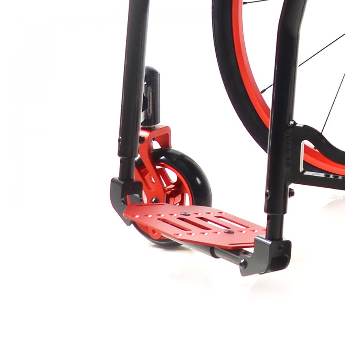 Модель продумана для комфорта в движении: передние колёса оснащены амортизаторами с регулировкой жёсткости, которые сглаживают неровности и снижают нагрузку на корпус. Спинка регулируется по углу наклона, а сиденье выполнено из прочной дышащей ткани, которая сохраняет форму при длительном использовании. Подлокотники съёмные и регулируются, что упрощает пересаживание и позволяет подъезжать ближе к столу. Подножка также настраивается по высоте.