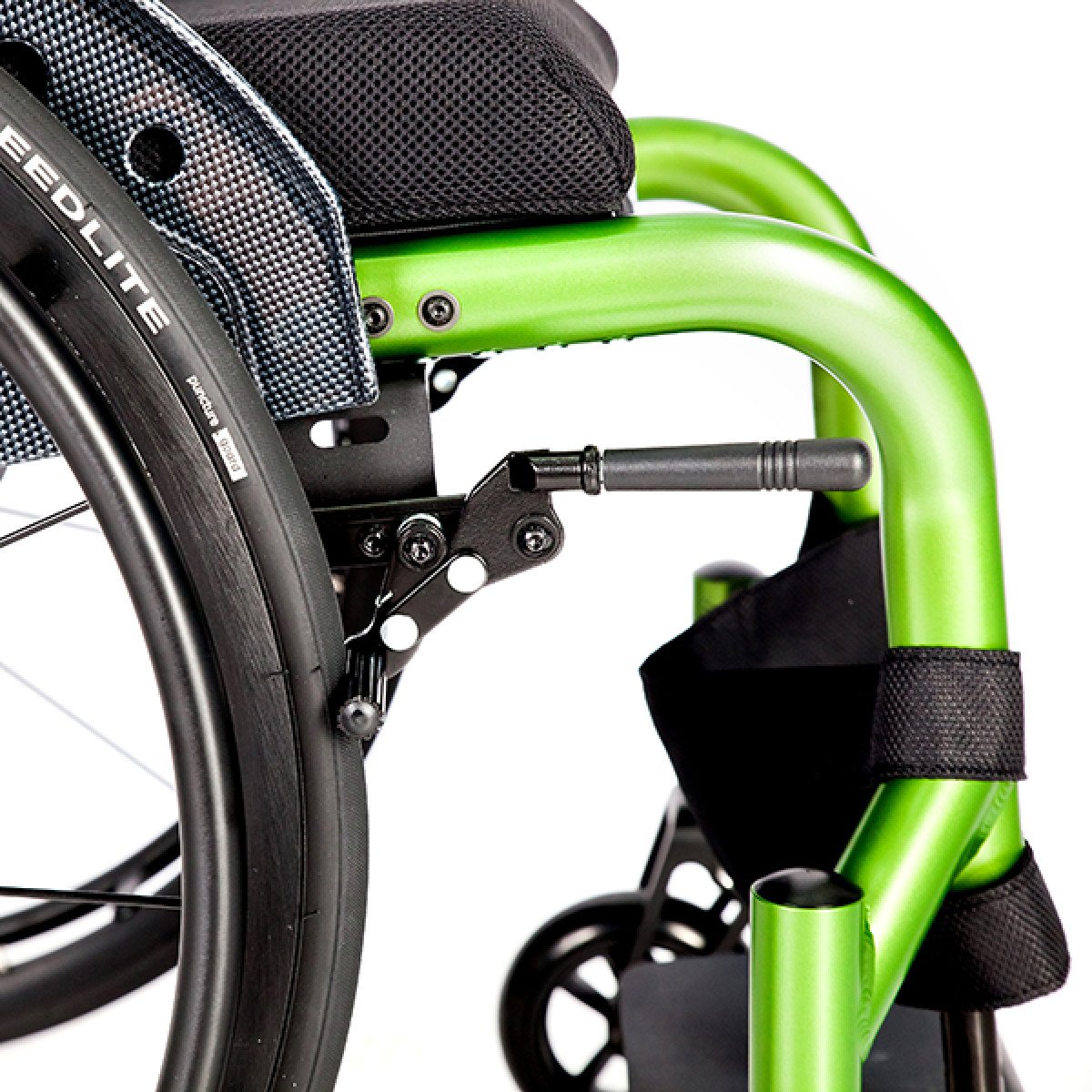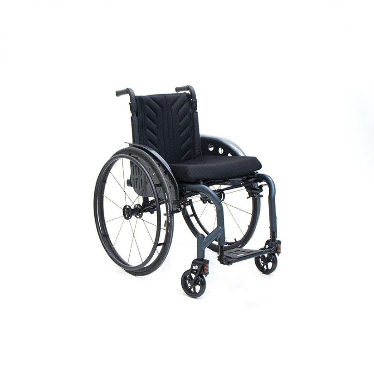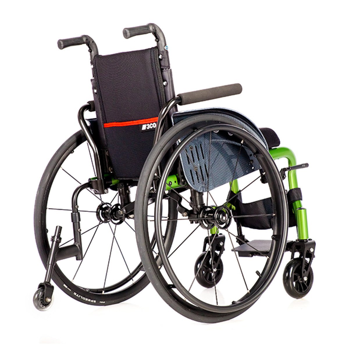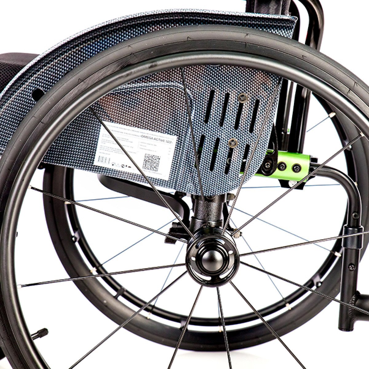 Задние колёса — быстросъёмные, доступны в вариантах с цельнолитыми или пневматическими шинами, что удобно при транспортировке и выборе под условия эксплуатации. Обода с антискользящим покрытием упрощают управление, а стояночные тормоза с регулировкой обеспечивают контроль и безопасность во время остановки. Складная конструкция облегчает хранение и перевозку коляски.