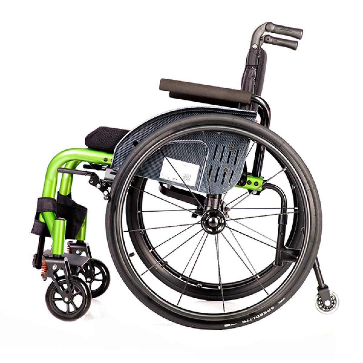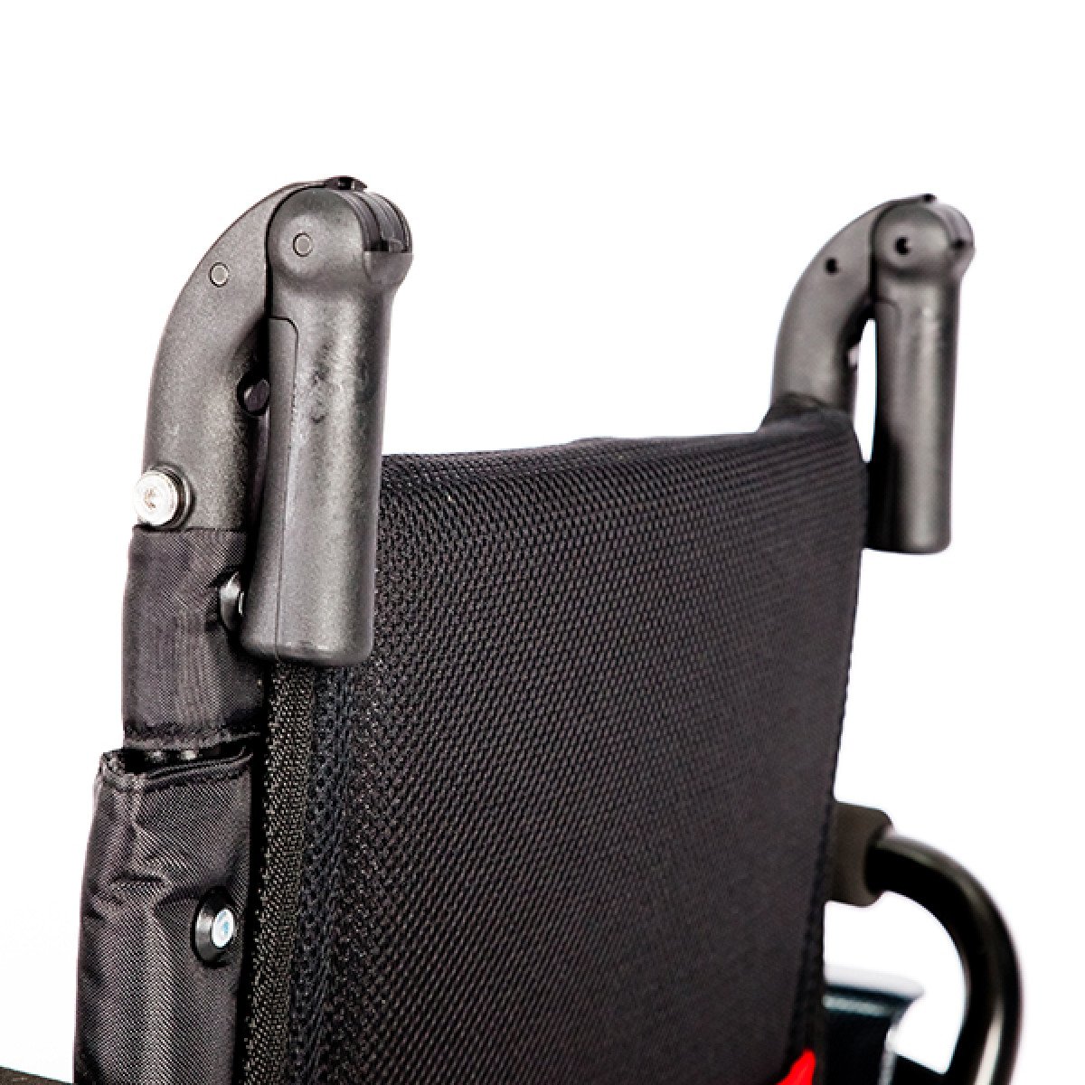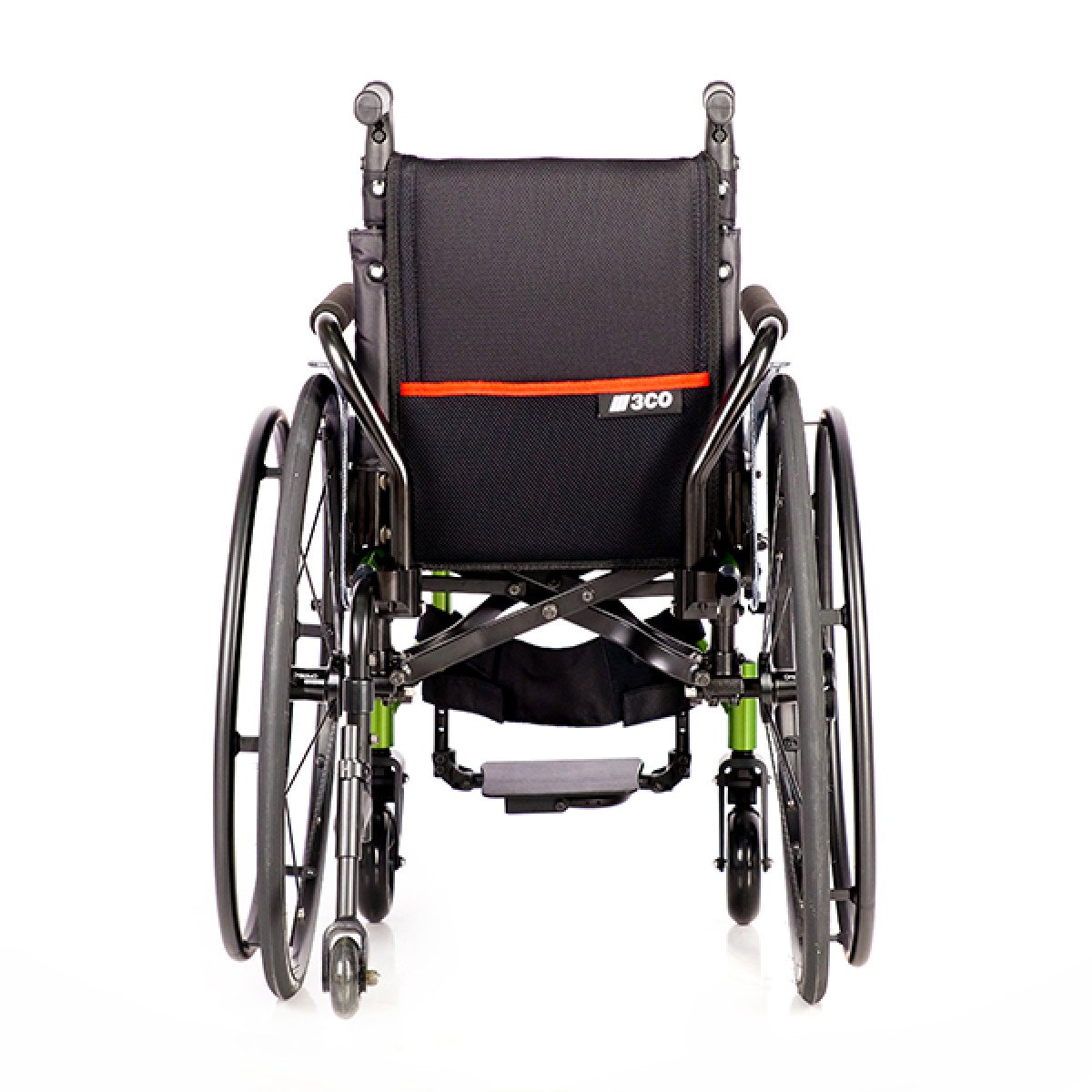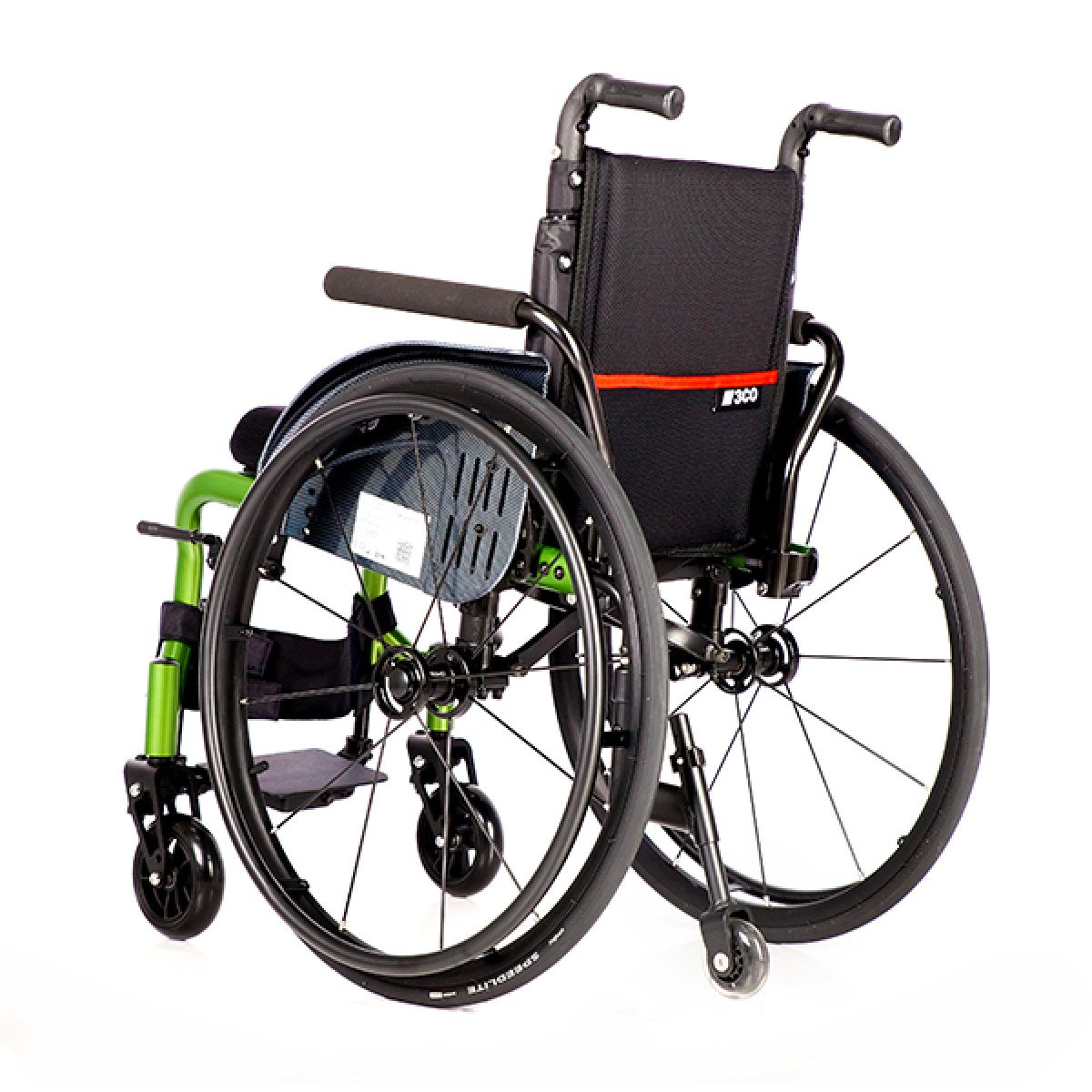 Задние колёса — быстросъёмные, доступны в вариантах с цельнолитыми или пневматическими шинами, что удобно при транспортировке и выборе под условия эксплуатации. Обода с антискользящим покрытием упрощают управление, а стояночные тормоза с регулировкой обеспечивают контроль и безопасность во время остановки. Складная конструкция облегчает хранение и перевозку коляски.