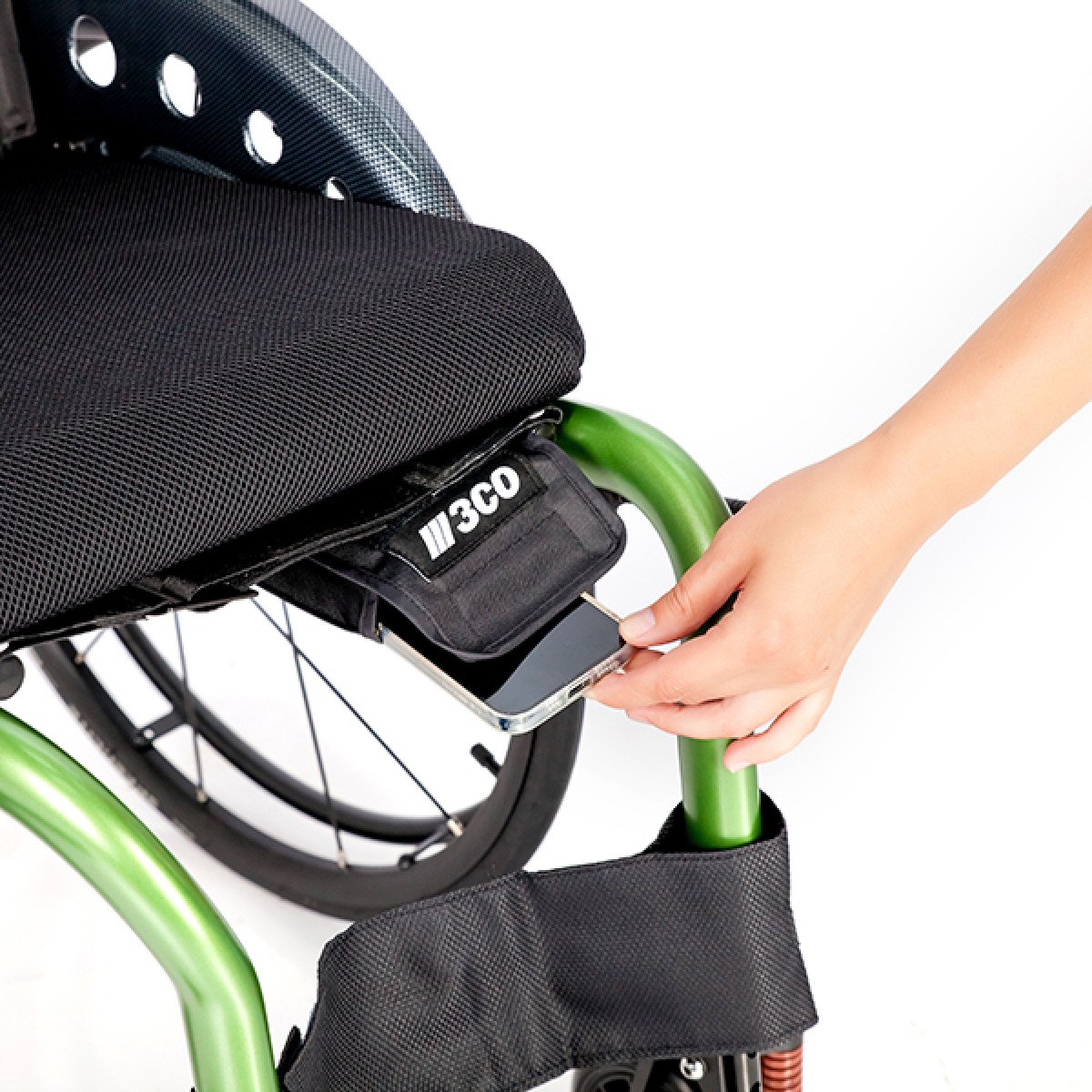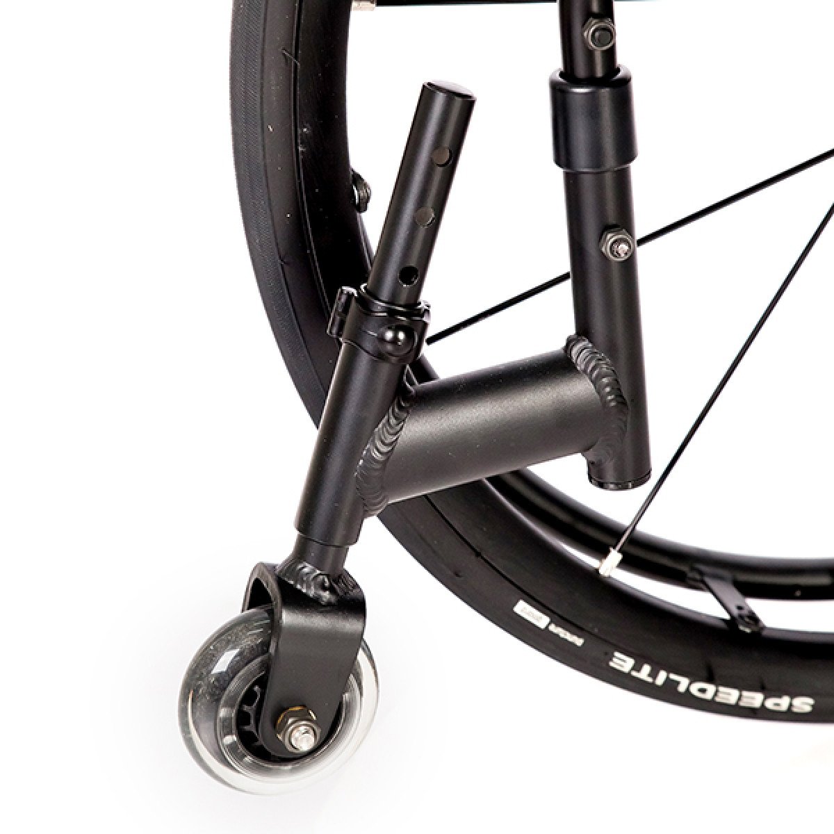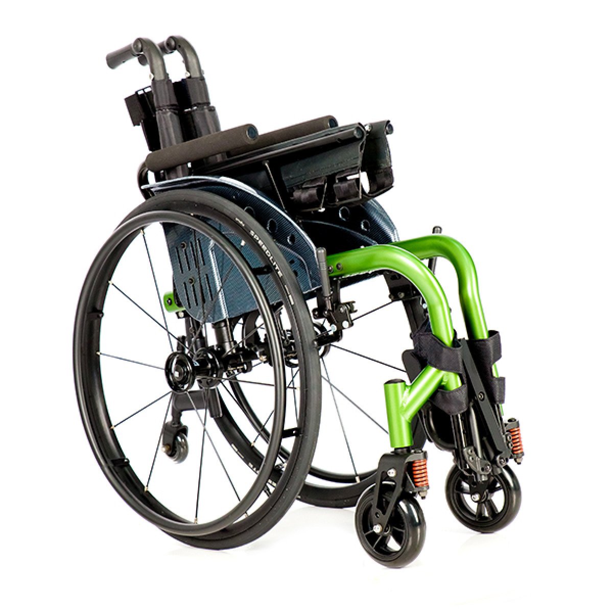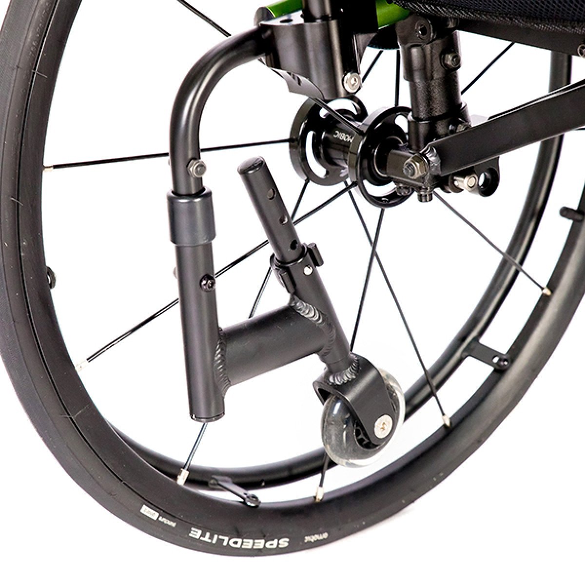 Задние колёса — быстросъёмные, доступны в вариантах с цельнолитыми или пневматическими шинами, что удобно при транспортировке и выборе под условия эксплуатации. Обода с антискользящим покрытием упрощают управление, а стояночные тормоза с регулировкой обеспечивают контроль и безопасность во время остановки. Складная конструкция облегчает хранение и перевозку коляски.