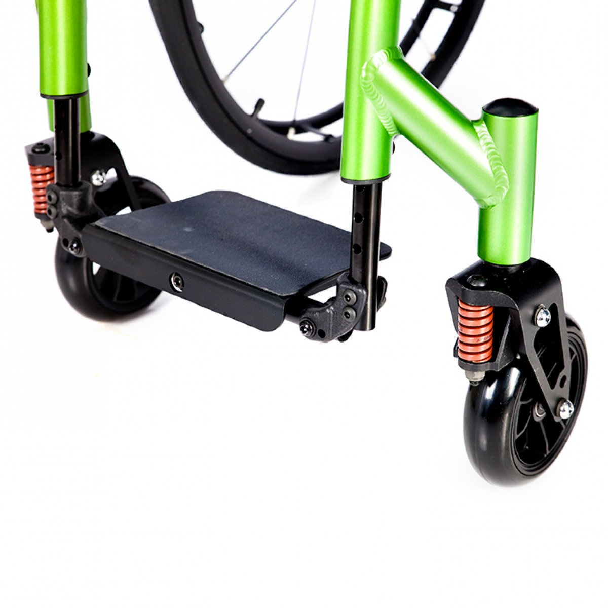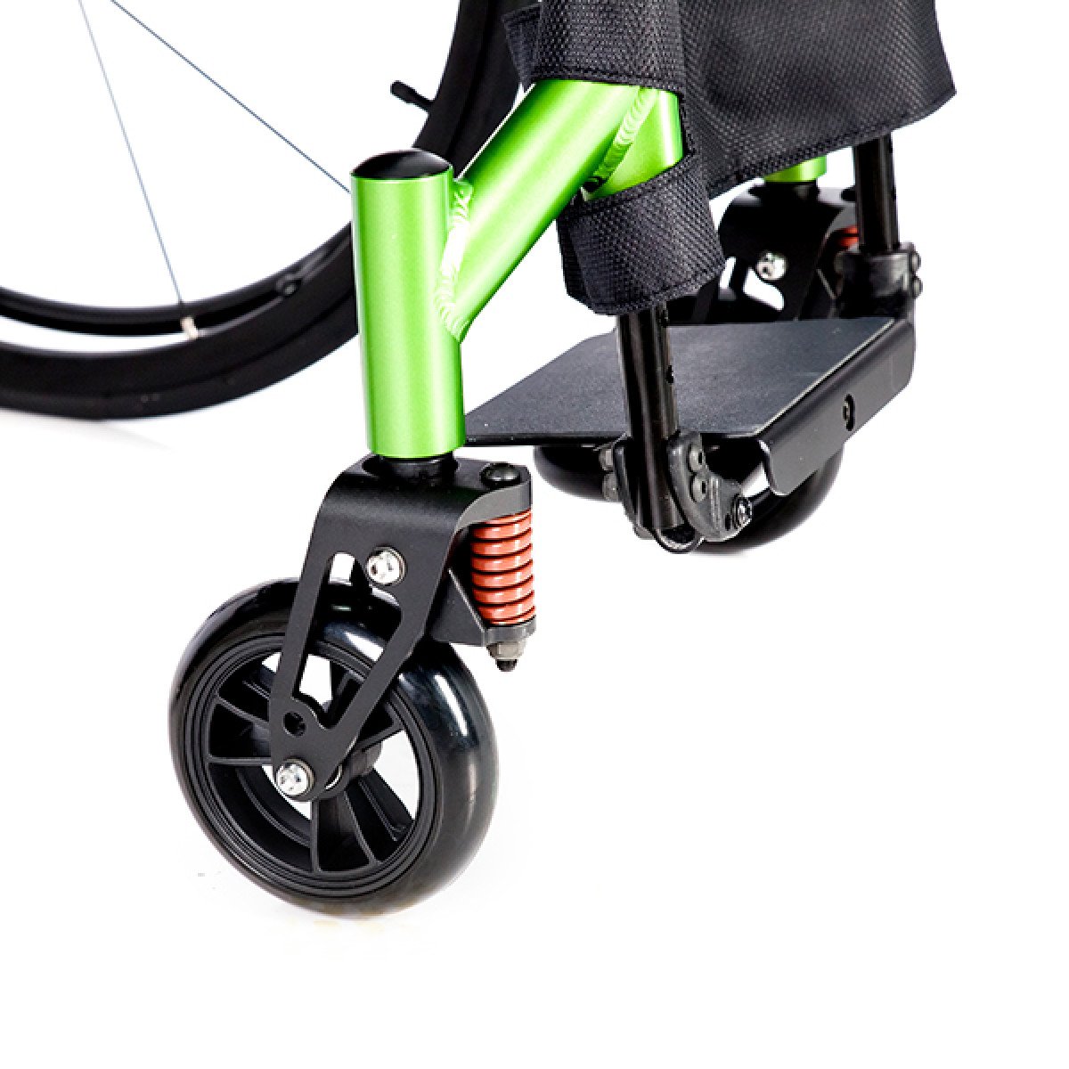 Коляска обеспечивает более плавное движение за счёт амортизаторов в вилках передних колёс с регулировкой жёсткости — это снижает вибрацию и нагрузку при езде по неровным поверхностям. Подлокотники съёмные, с мягкой опорой и боковой защитой, что упрощает пересаживание и делает посадку устойчивее.