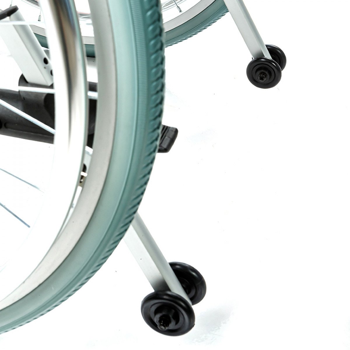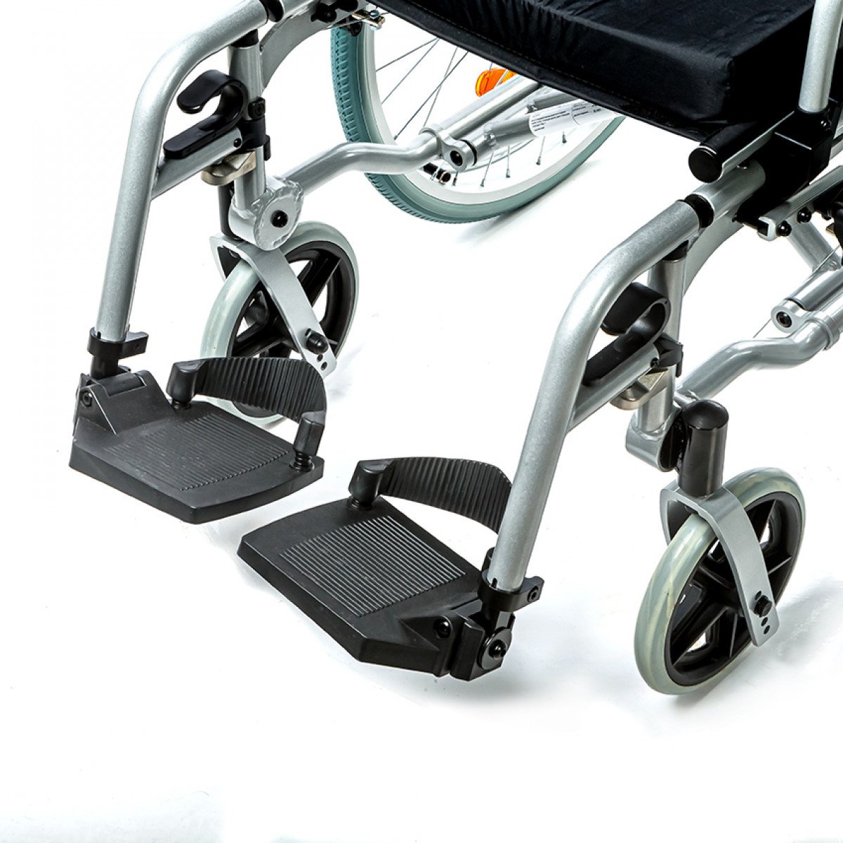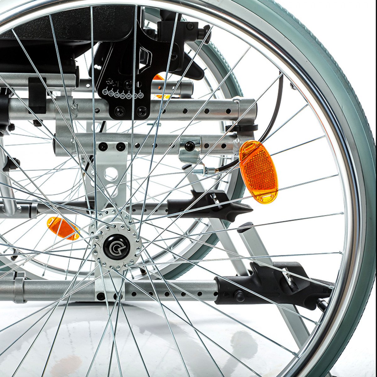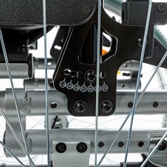 Рама выполнена из алюминиевого сплава с антикоррозийным покрытием, что обеспечивает прочность и долговечность. Передние и задние колёса доступны в вариантах: цельнолитые или пневматические — под разные условия эксплуатации. Для устойчивости предусмотрены антиопрокидыватели с регулировкой по высоте, которые при необходимости можно снять.