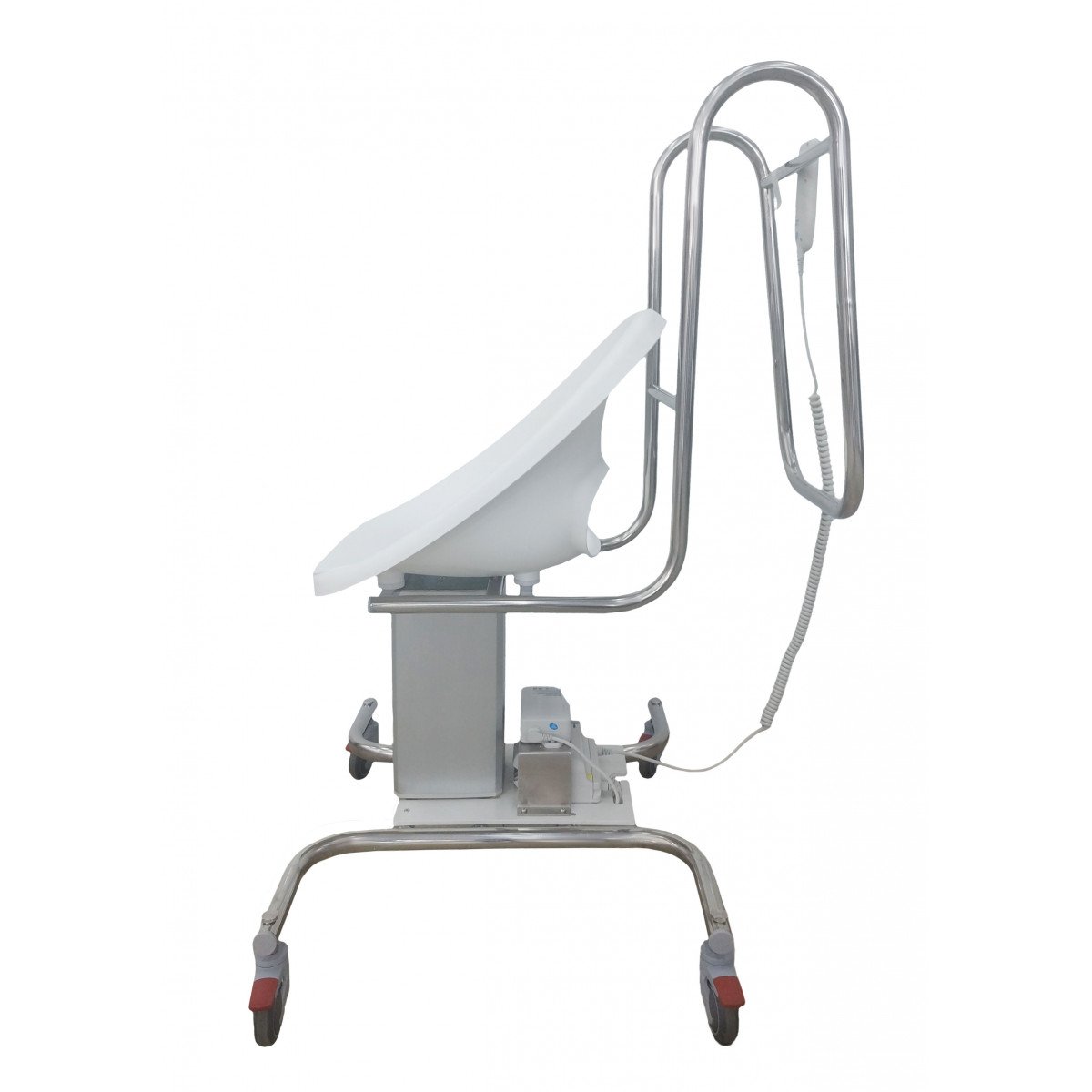 Конструкция оснащена электрическим приводом, плавно поднимающим и опускающим кресло в вертикальном направлении. Основные элементы выполнены из прочной нержавеющей стали, а удобное сиденье надёжно закреплено на станине. Манёвренные поворотные колёса позволяют легко перемещать устройство даже в маленьких кабинетах, а эргономичная ручка помогает персоналу контролировать движение без усилий. Съёмный пульт управления делает работу с подъёмником простой и безопасной.