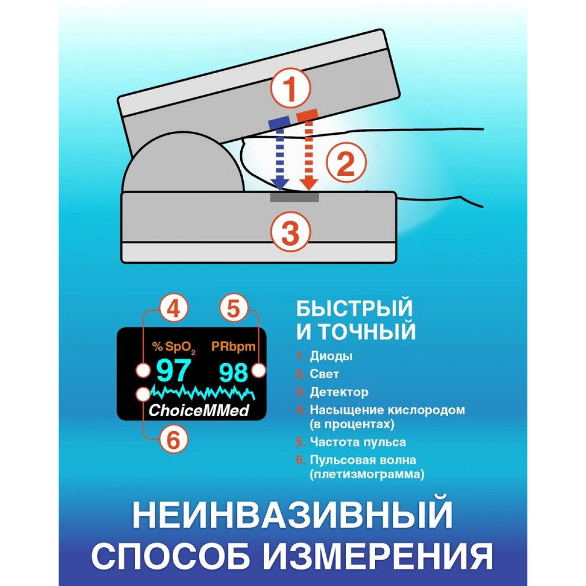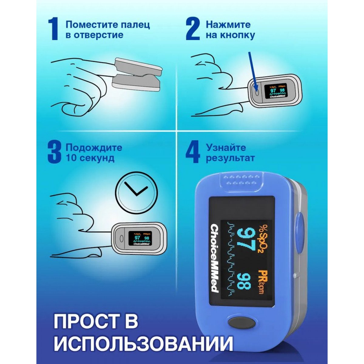 Пульсоксиметр ChoiceMMed MD300 C2 (ЧоизММед ЭмДи300 Си2) — компактный и удобный прибор для быстрого контроля уровня насыщения крови кислородом и частоты пульса в домашних и клинических условиях. Он подходит для личного самоконтроля, врачебной практики и использования в медучреждениях: терапии, хирургии, реанимации и службах скорой помощи.