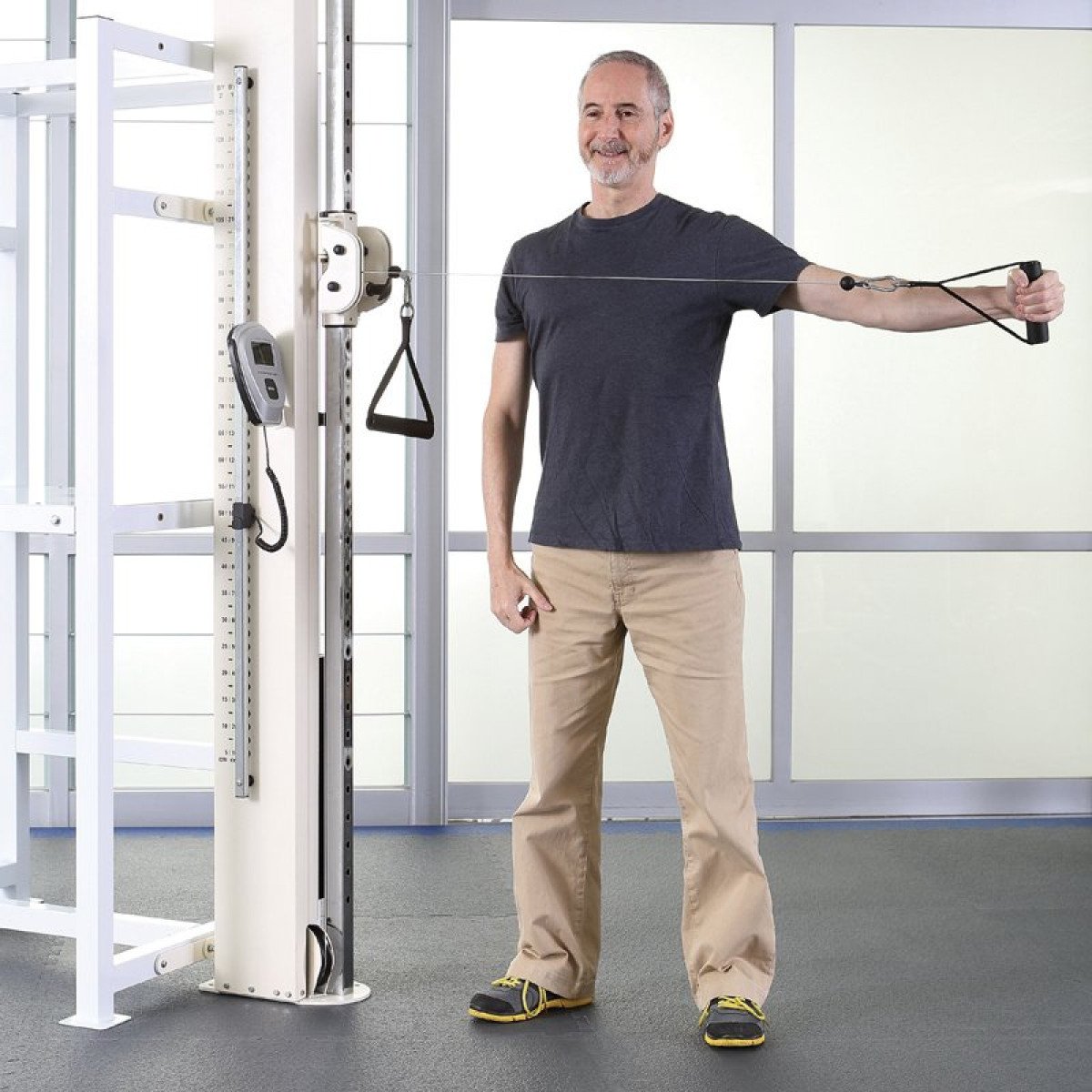Тренажёр оснащён двумя рукоятками, которые соединены тягами через блоки, создающими сопротивление при прикладывании усилия. Упражнения с этим тренажёром развивают мышцы и улучшают подвижность суставов. Для увеличения нагрузки можно использовать дополнительные веса, которые устанавливаются с шагом 0,5 кг, начиная от 1 кг и до 10 кг на правой стороне тренажёра. Удобный механизм фиксации позволяет точно настраивать интенсивность тренировки, что делает его идеальным выбором для реабилитации и силовых тренировок.